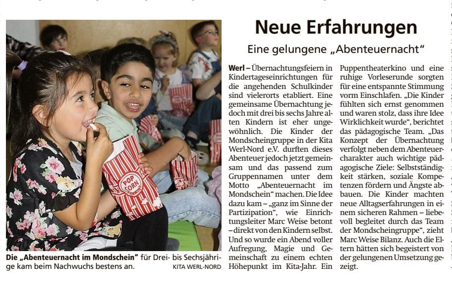 Am 06.06.2025 erlebten die Kinder der Mondscheingruppe in der Kita Werl Nord e.V. (Droste-Hülshoff-Str.) ein unvergessliches Abenteuer: Eine Übernachtung unter dem Motto „Abenteuernacht im Mondschein“. Die Idee dazu kam – ganz im Sinne der Partizipation – direkt von den Kindern selbst. Und so wurde ein Abend voller Aufregung, Magie und Gemeinschaft zu einem echten Höhepunkt im Kita-Jahr.